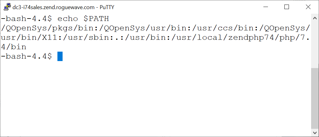 The commands for the installation will work if they can be found. Check to see if /QOPenSys/pkgs/bin is the first path in your path list by typing echo $PATH as illustrated below. If the path is not set, please refer to our installation instruction for details on how to set that up by created a hidden file called .profile.