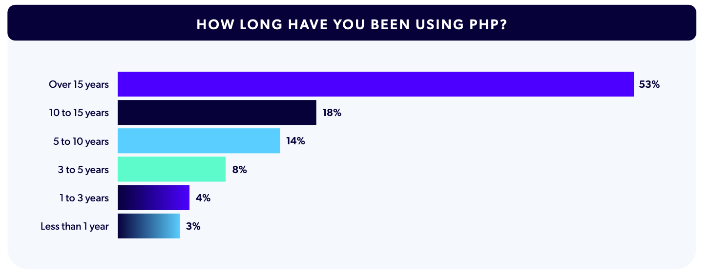 We also asked survey takers to share how long they’ve been using PHP. In an echo of our 2025 findings (past report editions available here), over half of the participants have been using PHP for 15 years or more. This was followed by 10 to 15 years (18%) and 5 to 10 years (14%). The remaining 15% have been using PHP for 5 years or less.