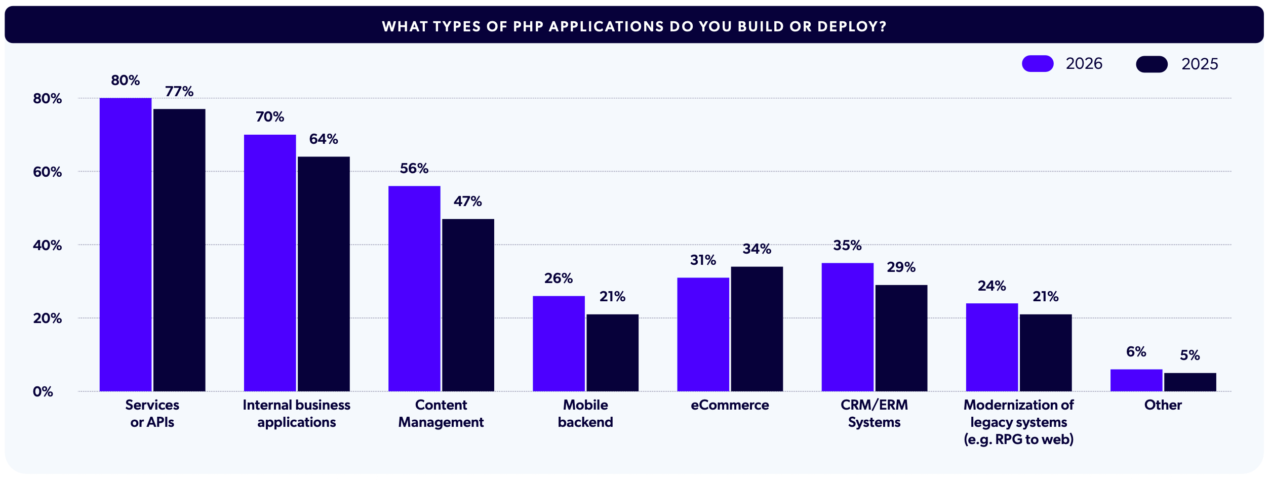 As with previous years, Services or APIs was the top type of PHP application (80%), followed by Internal Business Applications (70%) and Content Management (56%). To fully understand our data, we then compared the 2026 results to 2025. While the top types of PHP applications remained consistent year over year, the exact percentages shifted slightly, suggesting that teams are using less out-of-the-box applications such as CMS and e-Commerce, and may be moving to more custom solutions.