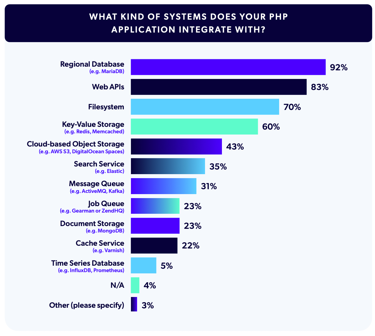 Next, we asked with which kinds of systems participants’ PHP applications were integrated. As PHP is a “glue” language of the web, and most teams integrate with several systems at once, we gave the option to select multiple answers. As with previous years, Relational Databases were the top selection at 92% of applications, followed by Web APIs (83%), Filesystem (70%), and Key-Value Storage (60%).