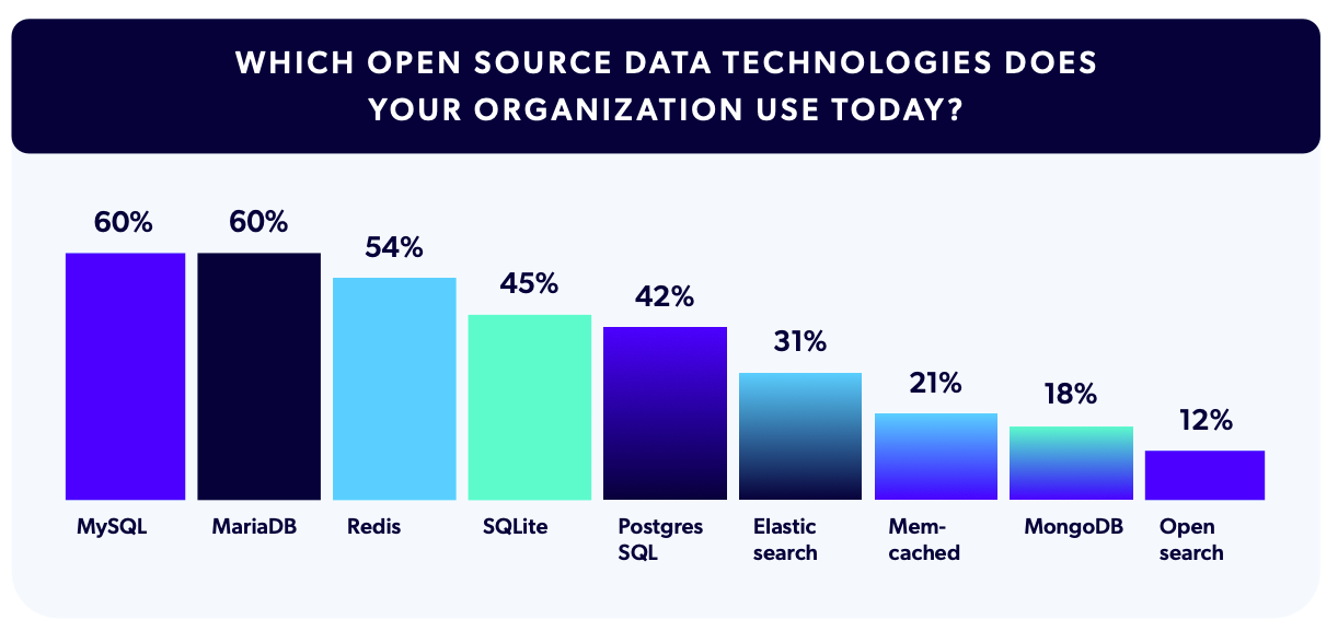 With Relational Databases as the top integration, we also asked which open source data technologies were currently used at participants’ organizations. MySQL and MariaDB tied for the top-used data technology at 60%. However, in Europe and the UK, MariaDB rose to to the top position over MySQL, at 67% vs. 58% of applications.