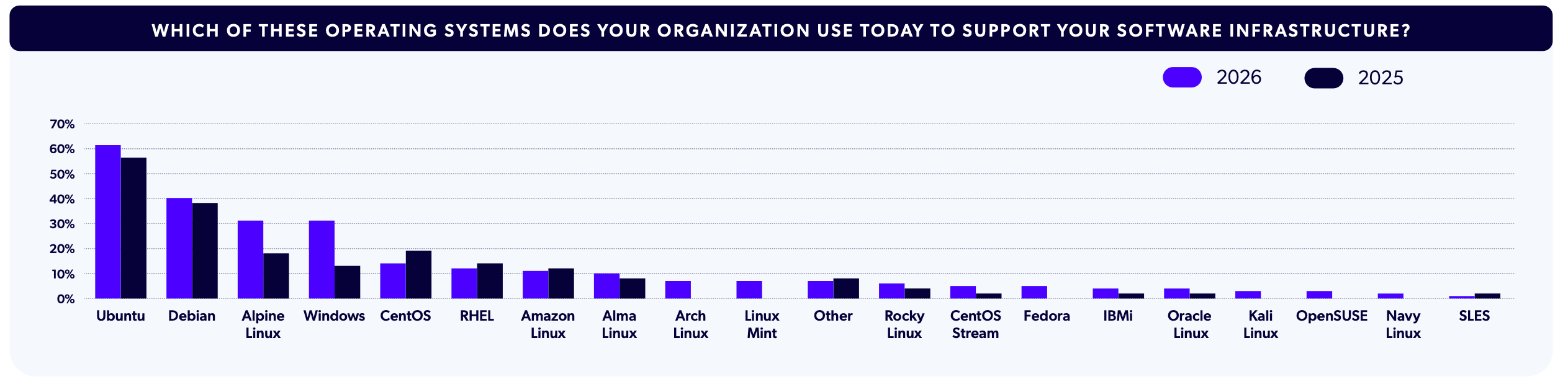 Comparing 2026 results with 2025, it is unsurprising to see CentOS fall in usage, as it has been EOL for over a year. However, we also saw a large jump in Windows usage, rising to 31% of responses in 2026 from 13% in 2025, and we continue to see a rise in Alpine Linux usage, which rose to 31% from 18%.